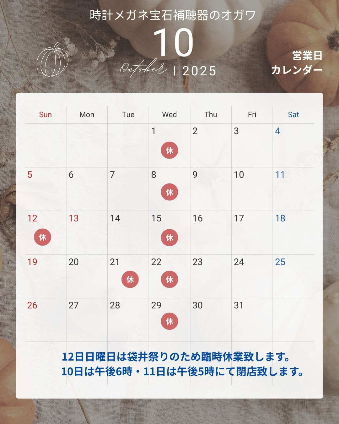 10月1日・8日・12日・15日・21日・22日・29日 が定休日です。