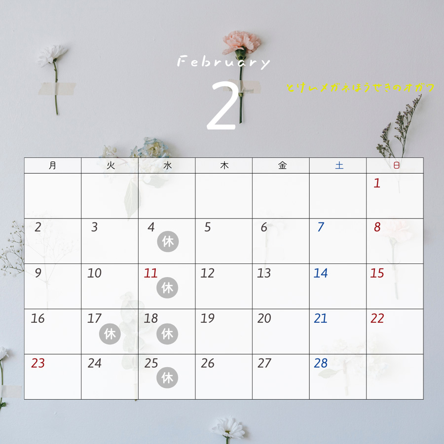 2月のカレンダー 定休日と営業時間のお知らせ